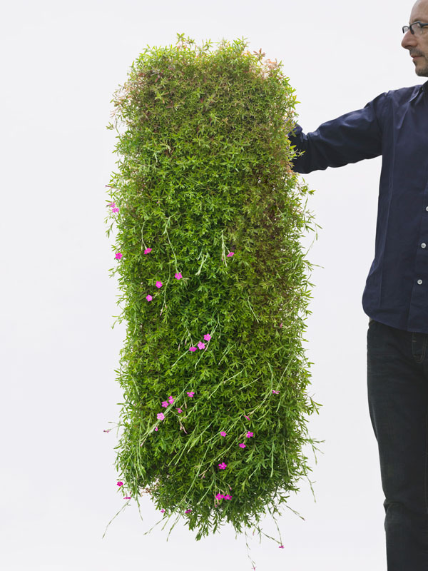Se livrant ainsi à l’éloge du végétal et au plaisir de son utilisation, Patrick Nadeau insiste sur la plasticité irréductible de ce matériau. Les supports qu’il conçoit, et le recours à des modes de cultures hors-sol technologiquement contrôlés, ne suffisent pas à maîtriser ce qui se produit. Cette « conduite forcée » ne présage pas complètement du résultat. La singularité des objets tient à leur forme potentielle, liée au choix des plantes. Les implants végétaux vont se développer jusqu’à parasiter l’objet et le coloniser. Les plantes s’accrochent, germinent, progressent. Le designer se retire, confiant ses miniatures à la pratique du jardinier.