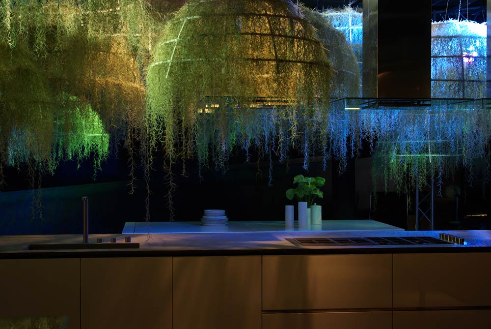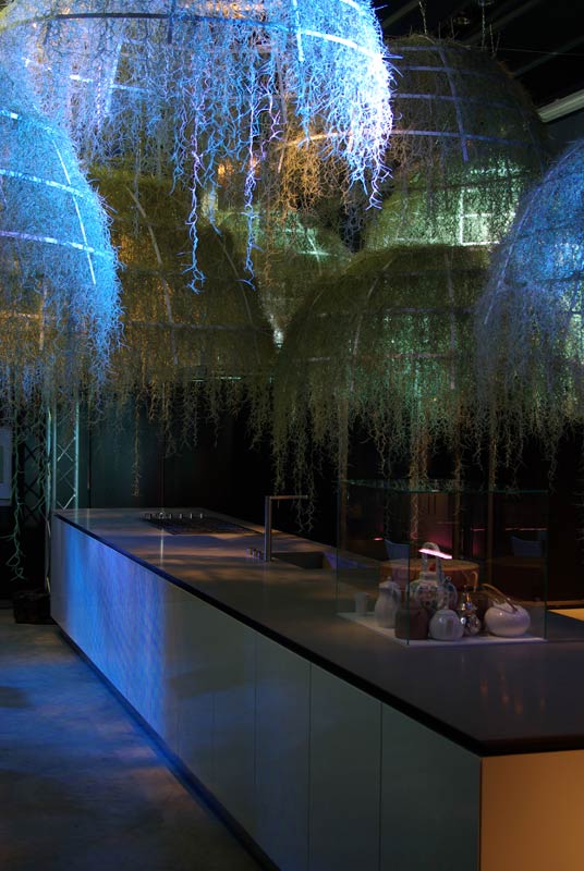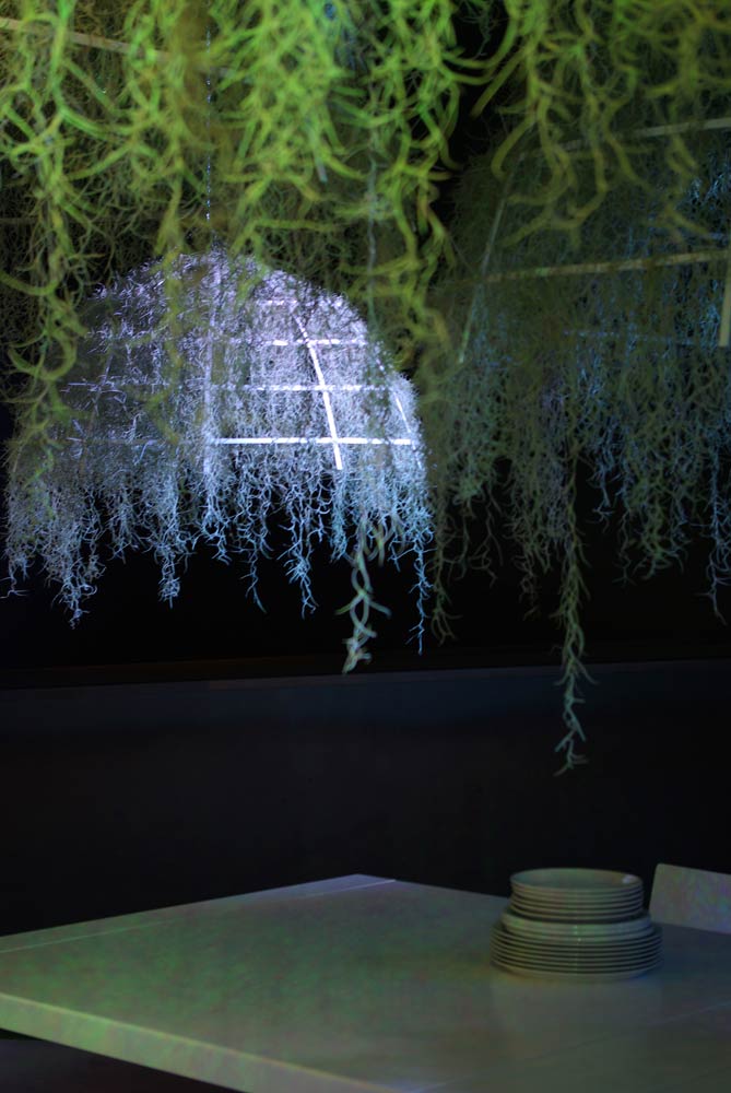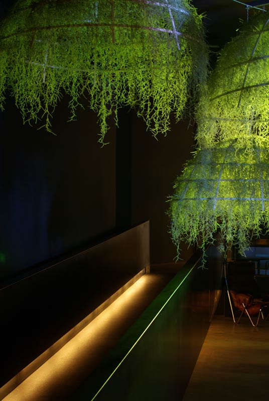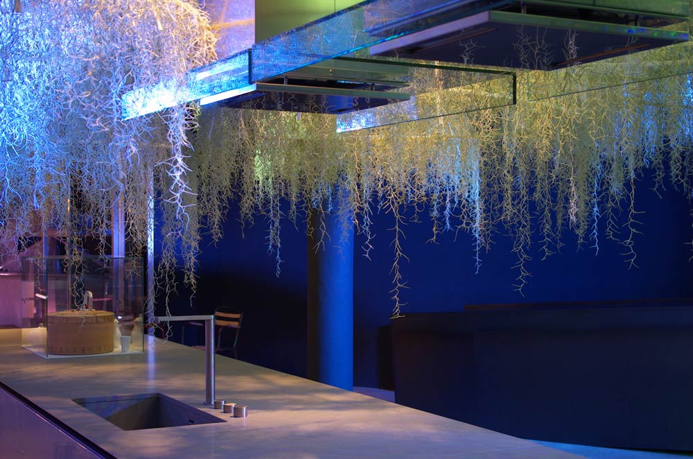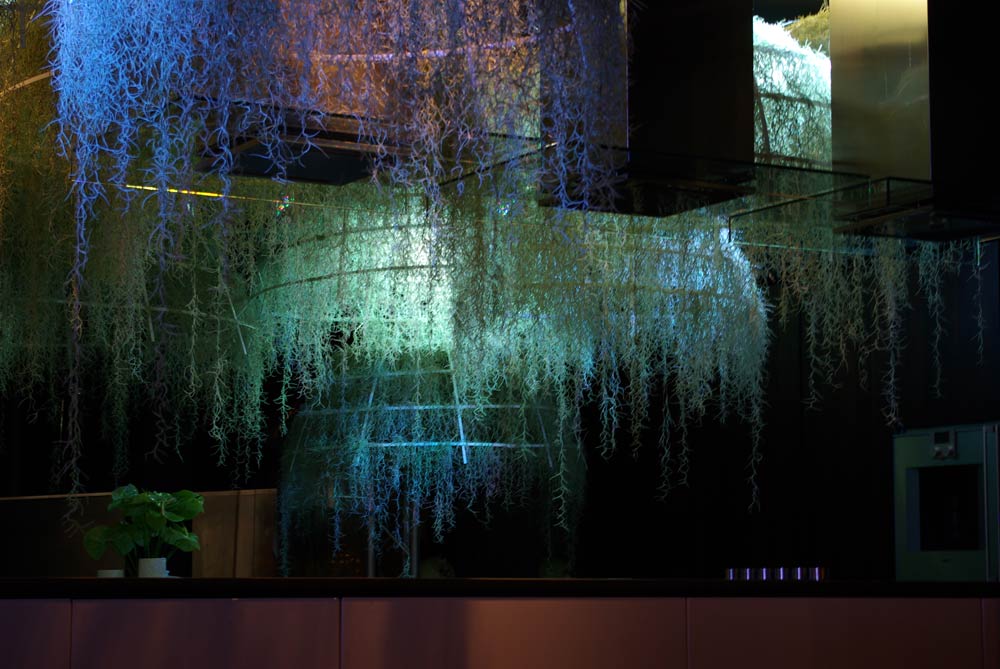 This installation is made of tropical plants, the epiphyte one – « Tillandsias usneoïdes » -They are hanging on Corian® structures. The origin of the tillandsias unsneoïdes comes from rain forests in South America. These is non-soil plants. They are directly fixed on the branchs of trees and they feed themselves only with the  air moisture.