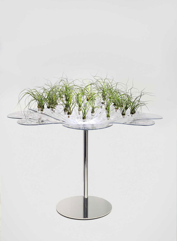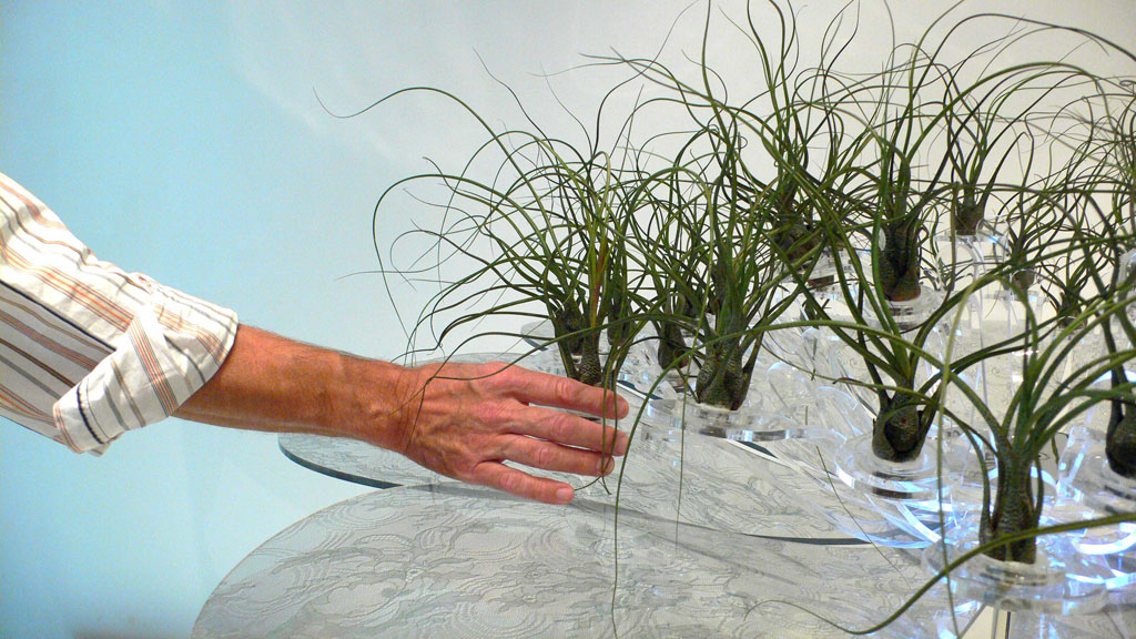 Les supports en Dacryldiffusent de la lumière dans les plantes. Les tillandsias implantés dans les cavités sèches et sans terre se nourrissent de l’humidité de l’air.