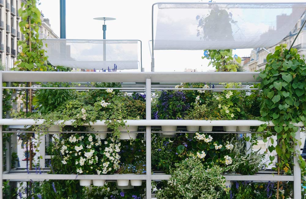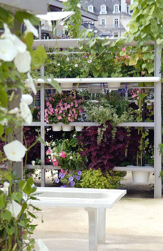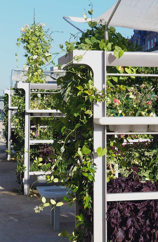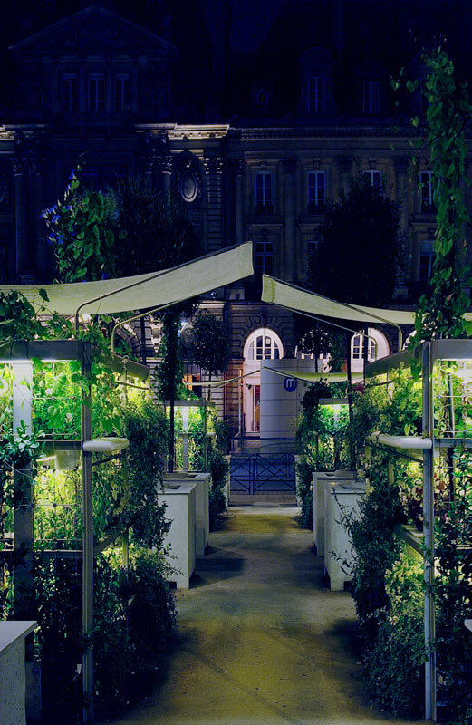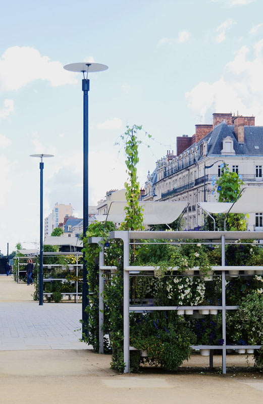 The Place de la République, a public square in the historical center of the city of Rennes, is at the heart of pedestrian movement through the downtown area. Its location, over the Vilaine (River that flows through the city) determines its architectural, concrete slab design. Such a surface does not permit heavy, weight-bearing earth loads: thus all vegetation and trees are featured in pots or boxes. These planted elements structure the public space. Uniting aspects of both public square and garden, this project proposes a new vision for the urban space. It harmonises the open use of the city square while also featuring areas of calm and conviviality in the presence of vegetation. The result is obtained by the placement of a screen of potted oak trees and vertical supports of vegetation called «planted shelving». Large benches also offer seating while punctuating the space. The planted shelving is an innovative implantation in an urban terrain. It proposes functional landscaping features as well as a flexible, modular support for plants, permitting seasonal, horticultural renewal of the landscape of the city square. Here, the vegetation is not purely decorative, but architectural, defining the nature and form of the Place de la République. In evening, transformed into outdoor lighting, the leafy shelving diffuse a soft, singular luminescence across the public square.