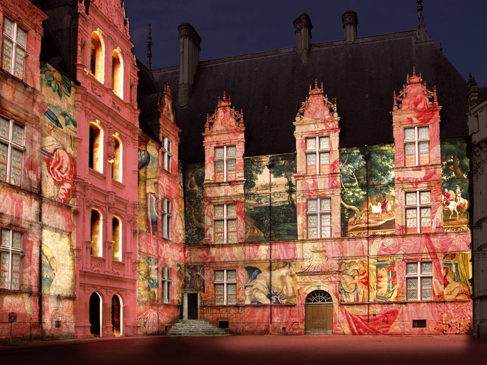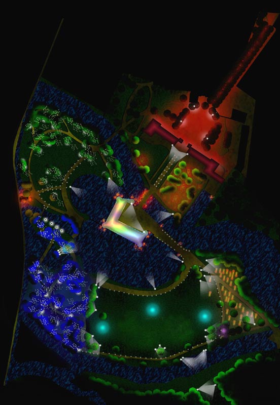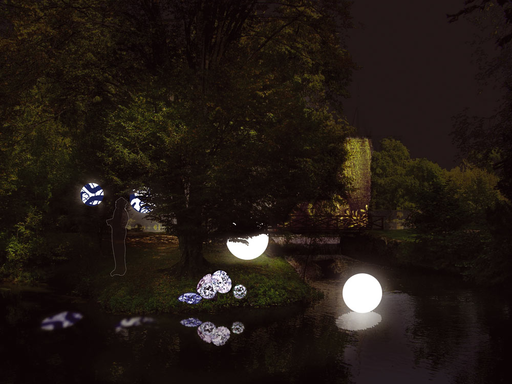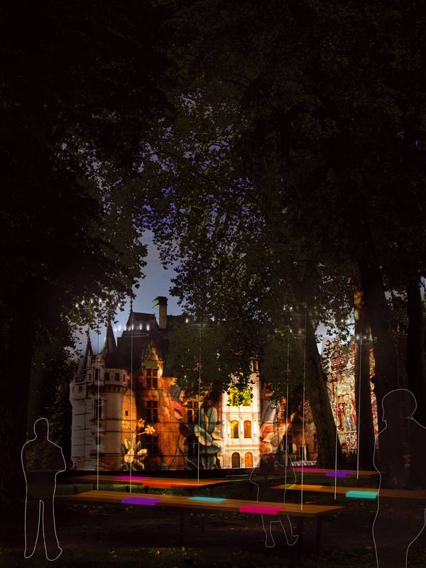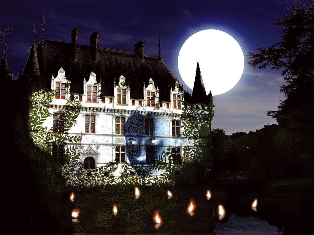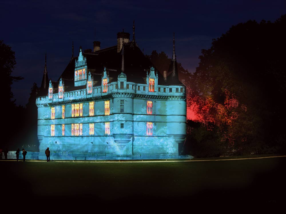 Scénographie nocturne autour du château d’Azay-le-Rideau.